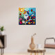 A sweet poster with a cute illustration of a colorful abstract cat surrounded by flowers, butterflies and the sun in a paper quilling impasto style.