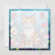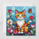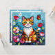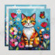 A sweet card with a cute illustration of a colorful abstract cat surrounded by flowers, butterflies and the sun in a paper quilling impasto style.