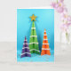 The card shows three handmade paper trees in bright colors like lime green, purple, and orange, each with unique designs 🎄. The biggest tree has a shiny golden star on top that sparkles, while the purple and orange trees have white garlands and silver studs for extra decoration. The background is a calm light blue, making the trees stand out. Small glittery baubles and sequins on the blue surface look like falling snow or ornaments 🎁. The trees are arranged differently for a cool, not symmetrical look, making the card interesting to look at. The colors and designs on the card feel new but also classic, making it perfect for the holiday season 🎅🏼. This card spreads holiday cheer and shows off how creativity can make something special out of simple things. Enjoy sending this card to make someone's day merry and bright!