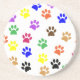 A drawing of colorful dog paw prints ranging from blue to yellow to purple.
