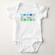 Stylish baby one piece romper, with colorful cartoon patterned elephants in two rows. Multi-colorful text, between the rows of elephants, reads Elephant.