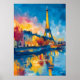 A radiant Fauvist Paris cityscape featuring the Eiffel Tower illuminated at golden hour with shimmering river reflections. Warm expressive colors and soft brushwork bring romance and elegance to this iconic European landmark, perfect for travel lovers and refined modern interiors.