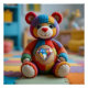 This charming and vibrant felt art piece, primarily created through needle felting, depicts a cheerful patchwork teddy bear sitting happily in a child's playroom. Made from brightly colored wool roving in shades of red, blue, yellow, green, purple, and orange, the bear features a crocheted-like texture with visible stitches connecting the color patches. Its sweet face has black bead-like or felted eyes and a bright red, heart-shaped nose. The paws are accented with soft white felted pads, and its tummy showcases a meticulously needle-felted prism diamond crafted from layered white, iridescent, and silk-like fibers, creating a sparkling, faceted effect that catches the light. Sitting atop a colorful, felted foam-style playmat, this joyful piece evokes warmth, tactile delight, and childhood wonder, set against a softly blurred child's room background.