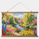 Beautiful garden landscape with vibrant flowers in pink, yellow, blue, and purple tones alongside a serene river. Green weeping willow and lush vegetation create an idyllic spring scene. Impressionism-inspired art with vivid colors and peaceful atmosphere. Perfect for nature lovers, floral gardens, and relaxing landscapes. A design that brings peace, joy, and the beauty of spring.