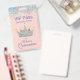 Chic Quinceañera party accessory badge done in a light peach, with a silver crown and graphics of colorful glitter, along the top. Lavender colored text is ready to personalize for your daughter's big day.