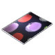 This artwork features a collection of overlapping circles, or "polka dots," in varying sizes and colors set against a dark background. The arrangement of the dots is somewhat random, creating a sense of playful spontaneity. A soft purple border frames the composition, adding a gentle touch to the overall design.