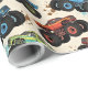 This dynamic monster truck pattern boys' wrapping paper features a repeating design of colorful red, blue, and teal monster trucks catching air, with realistic mud splatters. It is perfect for young racing fans and truck enthusiasts.
