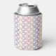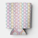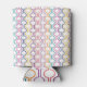 This can cooler has an art deco design of orange, turquoise, pink, blue, purple, and yellow half circles connect with lines on a field of white.