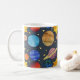 A bright, playful pattern featuring watercolor planets and stars on a dark background. Made to feel fun and full of cosmic energy.