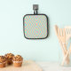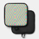Colorful pot holder with a vibrant, geometric pattern of concentric diamonds in pink, blue, and green on the front; plain black fabric on the back.