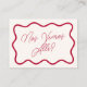 A Spanish language RSVP enclosure card to match our Wavy Frame Retro Wedding collection. An English version of this design is available in my store for bilingual weddings. This design features the text in cherry-red color chic script calligraphy. There is a QR code to RSVP online & see other details on your wedding website. View the collection linked on this page for matching items. Feel free to message me with any questions, I'll be happy to help! RSVP de boda en español para que los invitados confirmen su asistencia. RSVP de boda en español con marco ondulado y diseño retro. Editable con foto personalizada y tipografía moderna, perfecta para parejas que buscan un estilo divertido y único.