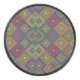 Colorful round item with vibrant geometric diamond patterns in various colors, including blue, green, yellow, and pink. Textured black sides add contrast.