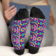 Colorful socks featuring an intricate geometric pattern in vibrant blue, purple, pink, and yellow hues. Black toes and heels provide contrast.