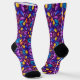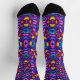Colorful socks with intricate, symmetrical patterns in purple, blue, and yellow hues. Black toes and cuffs add contrast, creating a vibrant, lively tone.