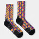 Colorful socks with vibrant abstract patterns in orange, purple, and black. The design features geometric shapes and swirling motifs, creating an energetic, playful tone.