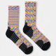 Colorful socks with vibrant geometric patterns in blue, yellow, red, and black. The top image shows the socks from above, and the bottom image shows a side view. The design conveys a playful and lively tone.