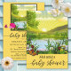 An elegant gender neutral baby shower invitation featuring a colorful landscape scene with a brilliantly shining sun. A beautiful pond, fresh wild spring flowers and a butterfly add to a joyful atmosphere. The "Baby Shower" texts are separate script images and can be deleted if you prefer custom texts.