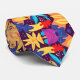 Colorful tie featuring a vibrant tropical design with large orange, pink, and purple leaves, set against a dark blue background, conveying a lively and bold tone.