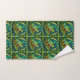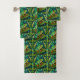 Colorful towels and washcloth feature a vibrant tree frog pattern with bold green leaves. The design is lively, evoking a tropical feel.