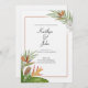 A tropical themed wedding invitation with colorful tropical greenery and florals.