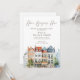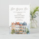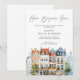 "Home Begins Here" with this charming and colorful watercolor European townhouse housewarming invitation. The simple and stylish design, featuring charming details and a clear layout for all event information, including the RSVP details. This unique card is ideal for a modern couple hosting a sophisticated yet fun party