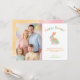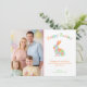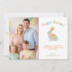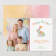 Personalizable Easter card featuring a custom family photo on one half and a cheerful watercolor design on the other, separated by a light pink line. “Happy Easter!” appears in colorful lettering above a bunny shape painted in watercolor washes. Beneath the illustration is space for your own Easter message in orange with room at the bottom for a name in green. On the back, large watercolor splashes in pink, orange and green continue the artistic theme. A bright and joyful way to send Easter greetings with a personal touch.