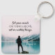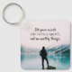 Inspirational quote scripture keychain depicts a man looking at a beautiful mountains and lake view and features Bible Verse Colossians 3:2, "Set you minds on things above, and not on earthly things."~