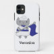 A grey cat wheres a colour guard outfit in blue and white and carries a blue flag with text that you can personalise on a phone case!