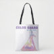 Customisable colour guard tote bag with colour guard silhouette figure and personalised name. Purple, blue and multi+coloured figure. Perfect gift for the colour guard fan in your life! Design by Jenn's Emporium.