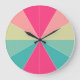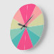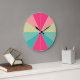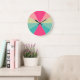 A clock face divided into 12 x 30 degree segments each divided with a white line and in a palette of 5 colours with adjoining segments at the top and bottom using the same colour creating symmetry and adding emphasis to the hours and half hour, looking rather like a pie chart.