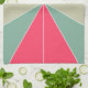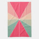 A design with 12 x 30 degree segments each divided with a white line and in a palette of 5 colours with adjoining segments at the top and bottom using the same colour creating symmetry.