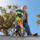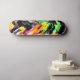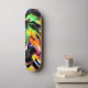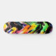 This unique skateboard features an abstract pattern in multiple bright colours and black.