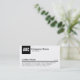 A business card with a 0.75inch square tonal or colour tab in the top left for monogram initials or could be alternatively used for a logo. Company name and business type aligned next to the tab. Name and job title are arranged above a horizontal line, with address, telephony, email and web details below. The reverse side of the card has the same initials, company name and business type on a flat colour background but arranged and aligned to the centre of the card. This template can be easily customised with your own details or further customised with your own logo or less standard fonts etc, don't forget to customised both sides.