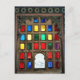 Brightly coloured glass panels in a decorated wood window frame. Rajasthan, India.