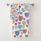Abstract art of hearts of different colours done in crayon, that gives it an almost cartoonish look, outlined in black against a white background.