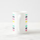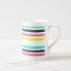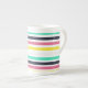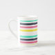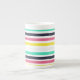 A colourful china mug with a striped pattern. The cooler is primarily white with horizontal stripes in black, pink, yellow, and turquoise.