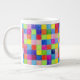 Squares of graph paper coloured in by hand with coloured pencils in random colours. No two adjacent squares have the same exact colour. Graph paper squares outlines are made up of light blue lines.