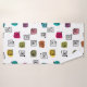 This towel set has a light pink washcloth, a darker pink hand towel and a bath towel with a mid-century modern design of scattered mazes, some with coloured blobs under them.