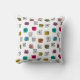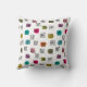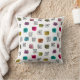 This throw pillow has a mid-century modern design of scattered mazes, some with coloured blobs under them.