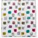 This shower curtain has a mid-century modern design of scattered mazes, some with coloured blobs under them.