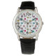 This men's watch has a mid-century modern design of scattered mazes, some with coloured blobs under them.