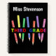 Start out the new school year with this Third Grade notebook which can both be used by teachers and students. The design consists of 7 different coloured pencils at different angles next to each other with the word "Third Grade" across them. This note book can be personalised by changing the name on it, and would make a great back-to-school gift.