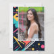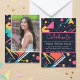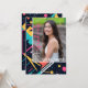 Step into the vibrant world of the '80s with our retro-inspired graduation announcement invitation! Against a backdrop of deep navy blue, bursts of neon pink, electric blue, and lime green form abstract shapes reminiscent of the era's iconic aesthetics. Front and centre, a cherished photo captures the essence of your achievement, radiating pride and accomplishment. Turn the invitation over to discover two more snapshots, showcasing the journey that led to this momentous occasion. Amidst the lively hues, our invitation message beckons: