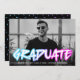 Trendy graduation announcement featuring the graduate's horizontal photo with "Graduate" displayed in colourful 90's-style lettering. Personalise the front of the bold graduation announcements by adding the graduate's name, school, and graduation year. The back of the announcement features a gradient confetti pattern in blue, turquoise, purple, and magenta colours.