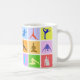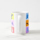 9 yoga pose silhouettes in 9 colour blocks (2 images) on a sturdy white coffee cup. Inspire your day when you drink from this inspired yoga coffee mug.