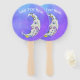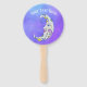 This program hand fan has a colourful abstract crescent moon with geometric shapes of circles, triangles, and a scroll and a pretty face with blue eyes on a purple sky background on the front and back. Customise your text with the template.