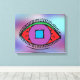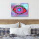 This is a very cool wrapped canvas with a colourful abstract eye drawing design in red, purple and blue on a purple and aqua background.