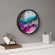 The size of the clock is dramatic and the abstract alcohol ink design is soothing and intricate at the same time. I chose the black frame that adds pop to the blue and gold design. The gold printing would be better in a slightly darker or larger font. I love it and I’m looking for just the right place in ny new apartment. I would recommend this clock for a personal gift or a present. I feel that the quality is excellent for the money! I’m a bit of a clock nut so I’m pretty particular about my purchases. The clock is larger in diameter than many if the clocks I have, so it stands out very well. I think a slightly darker printing color and a moderately larger size would best suit a professional decor or add more impact in a work place item.