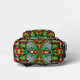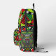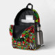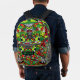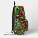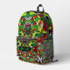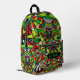 This all-over printed backpack is a true standout, boasting a vibrant and intricate pattern of geometric shapes and figures. The symmetrical design, featuring shades of green, red, white and black, is reminiscent of a kaleidoscope, turning everyday scenes into complex, mesmerising patterns. The central figure, subtly resembling a face, adds a touch of mystery and intrigue. But what truly sets this backpack apart is its customisable feature - the text printed in bold green letters at the bottom. This personal touch makes the backpack uniquely yours, reflecting your identity and style.