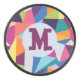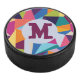 This hockey puck features an abstract bold and colourful design of geometric shapes. Customise your design by easily adding an initial, featured in magenta font (can be changed to any colour of your choice).